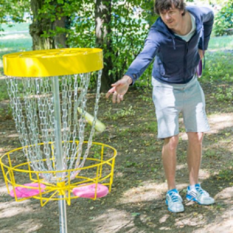 Most of the holes are in an open park space with trees, one hole on an open meadow, a flat terrain. |