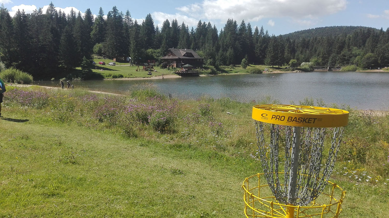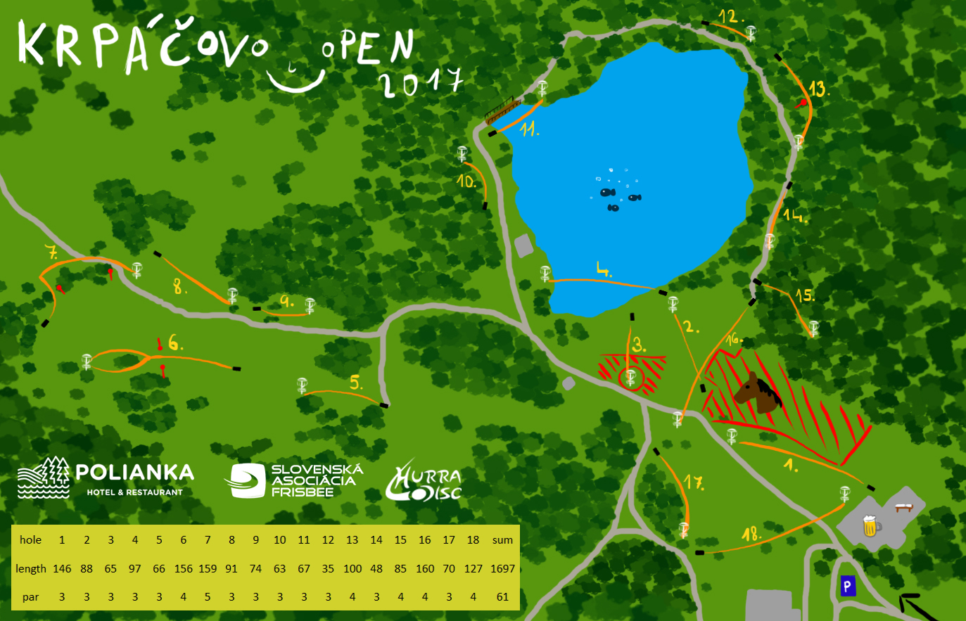 The course consists of two parts. 13 holes are situated at permanent course around the lake, other 5 are at meadows near the lake. Most holes are shaped by wavy terrain, while man has to throw both uphill and downhill. The part on the meadows offers longer, open holes, while part around the lake consists of short, technical holes, some of them in the forest. 18 holes in the natural enviroment (total length 1697 m), hilly terrain. Total 12 holes par 3, 5 holes par 4, 1 hole par 5, total par 61. |